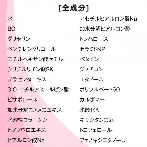 水、BG、グリセリン、ペンチレングリコール、エチルヘキサン酸セチル、グリチルリチン酸2K、プラセンタエキス、3-O-エチルアスコルビン酸、ビサボロール、加水分解コメヌカエキス、水溶性コラーゲン、ヒメフウロエキス、ヒアルロン酸Na、アセチルヒアルロン酸Na、加水分解ヒアルロン酸、トレハロース、セラミドNP、ベタイン、ジメチコン、エタノール、ポリソルベート60、カルボマー、水酸化K、キサンタンガム、トコフェロール、フェノキシエタノール