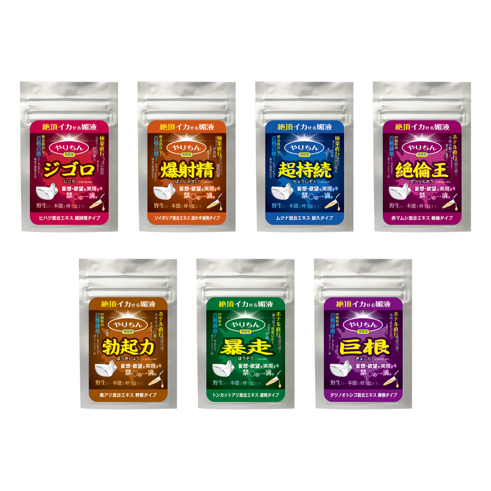 「巨根」「超持続」「勃起力」「絶倫王」「暴走」「爆射精」「ジゴロ」の7種類を、そのときどきの目的に応じて使い分けることが出来ます。