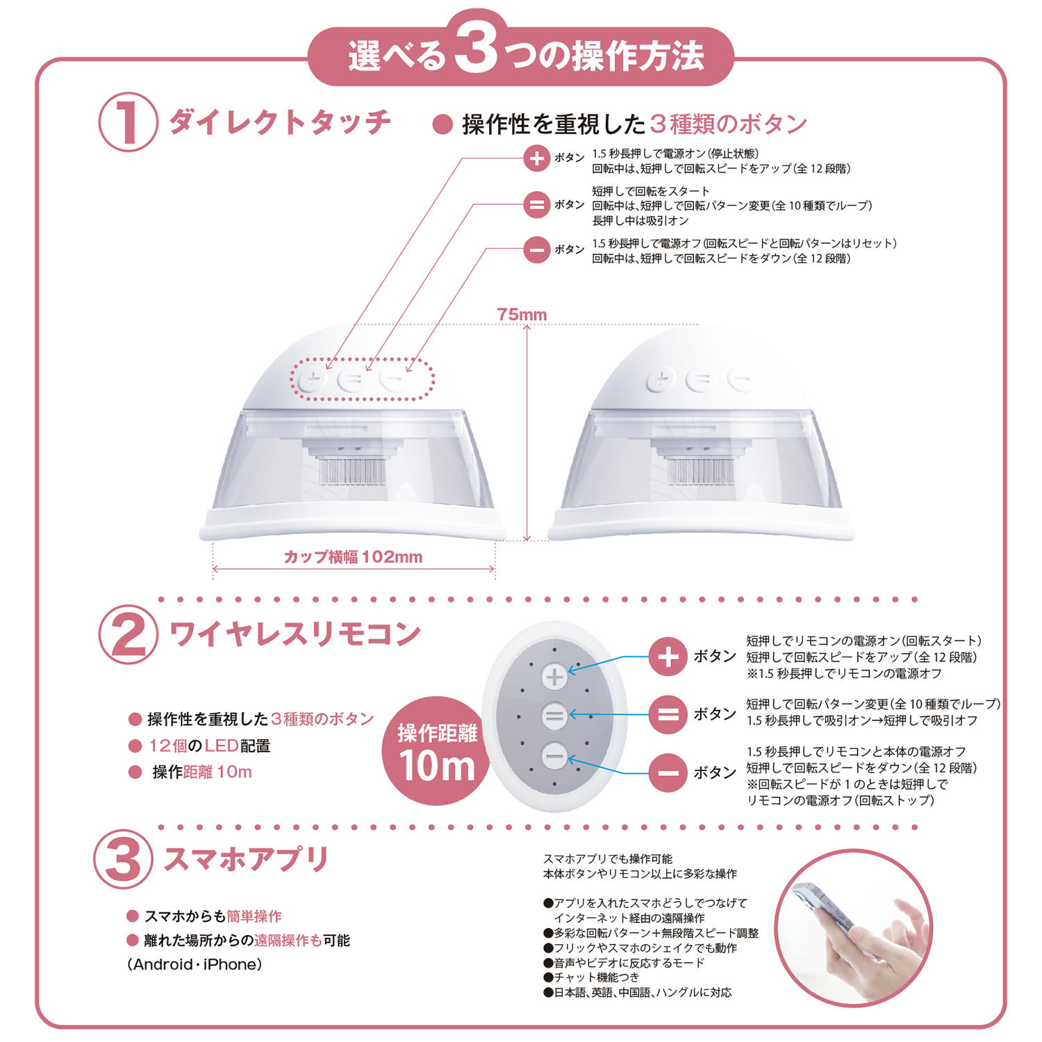 基本パターンに加え、「フリック操作」「シェイク操作」「ランダム動作」などなど、多彩な回転&吸引モードを搭載。