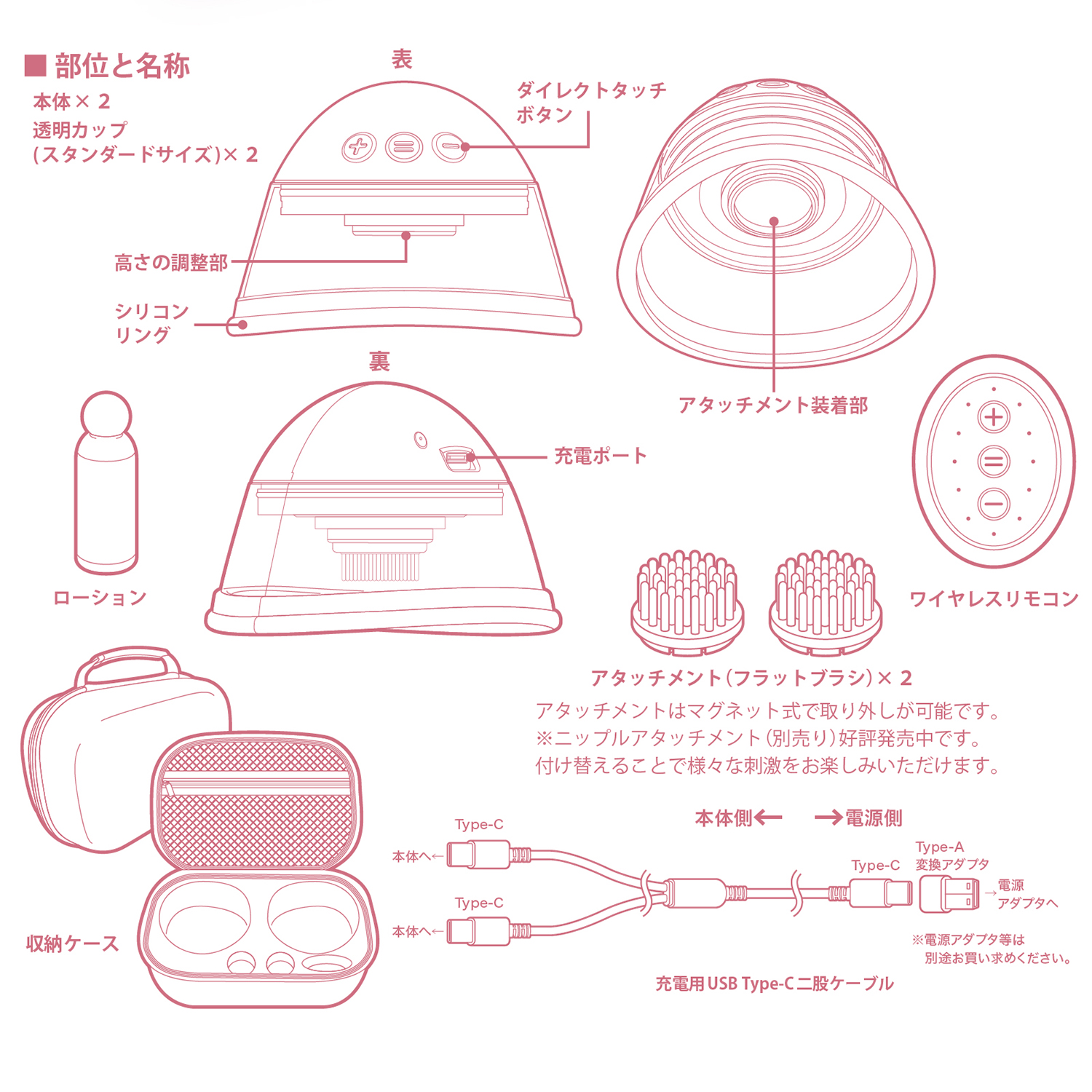 本体+透明カップ、ミニローション、アタッチメント(フラットブラシ)、ワイヤレスリモコン、充電用USB Type-C二股ケーブル、収納ケース