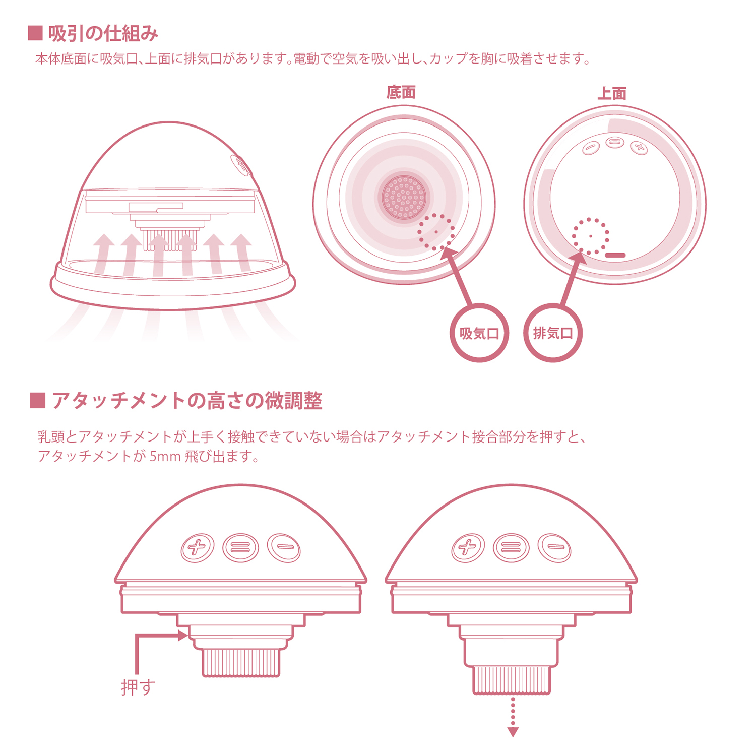 ・吸着させたカップは、身体を動かすと、空気が入ってはずれやすくなります。気になる方は、ブラジャーなどで固定してください。